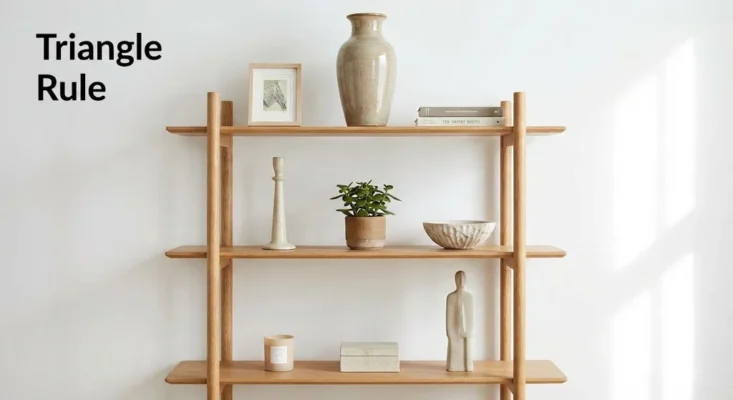 The most common mistake in DIY shelf styling is lining items up in a straight row. This creates a flat, boring visual. Instead, designers use the “Triangle Rule.”