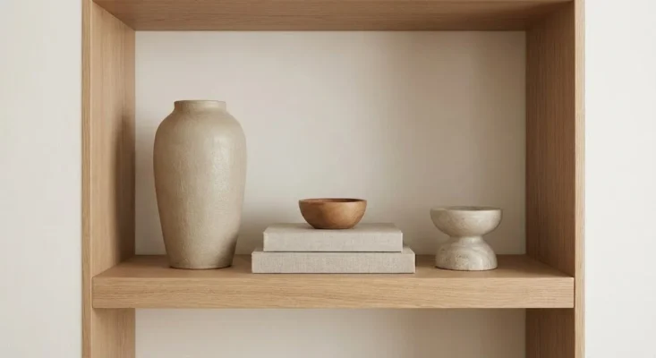 When grouping items on your wood shelf, try to stick to sets of three. A grouping of three objects of varying heights—one tall, one medium, one short—creates a “mini-story.” This prevents the arrangement from looking too symmetrical or “stiff,” which is a core tenet of the Wabi-sabi and Japandi aesthetics trending this year.